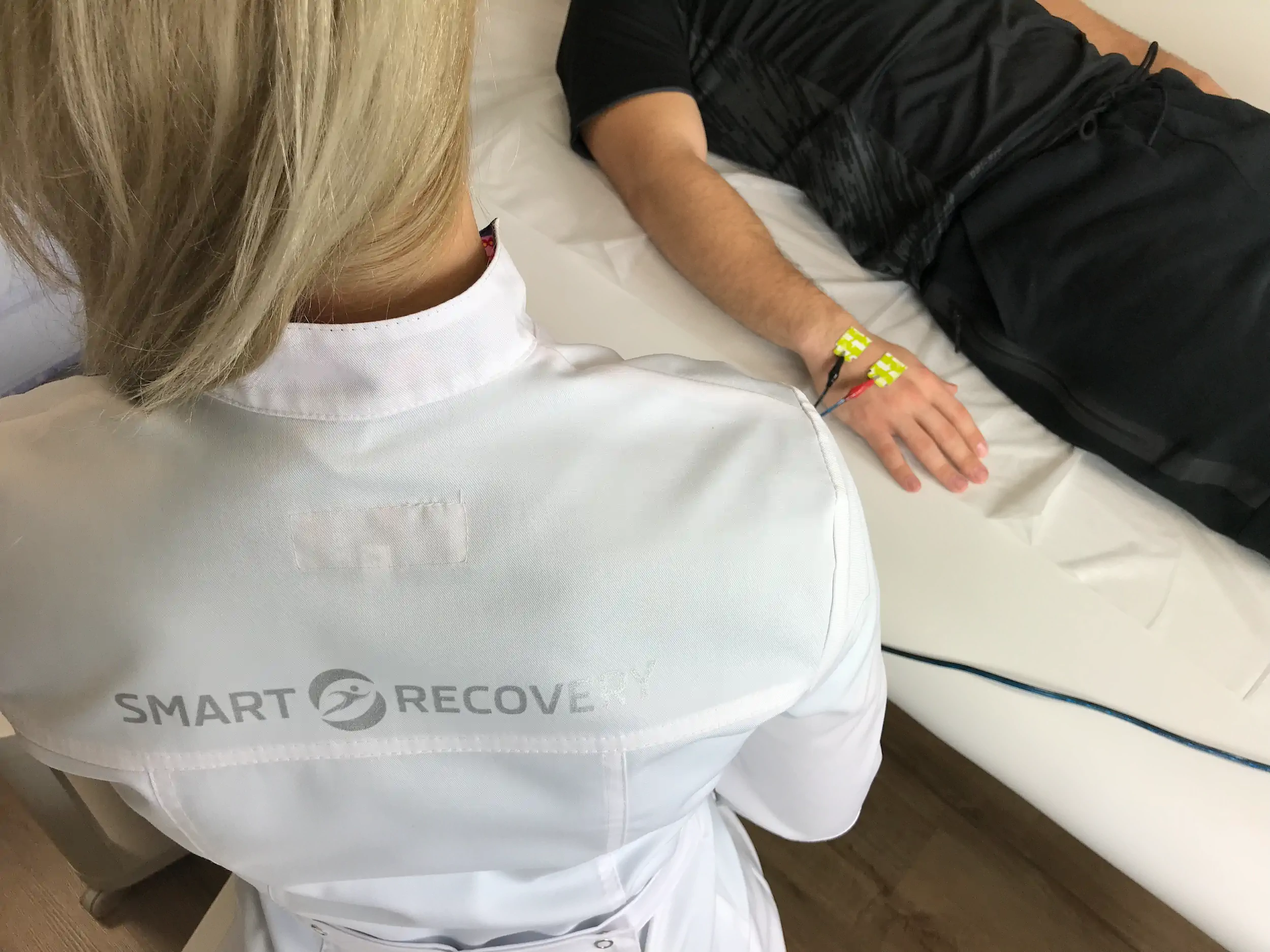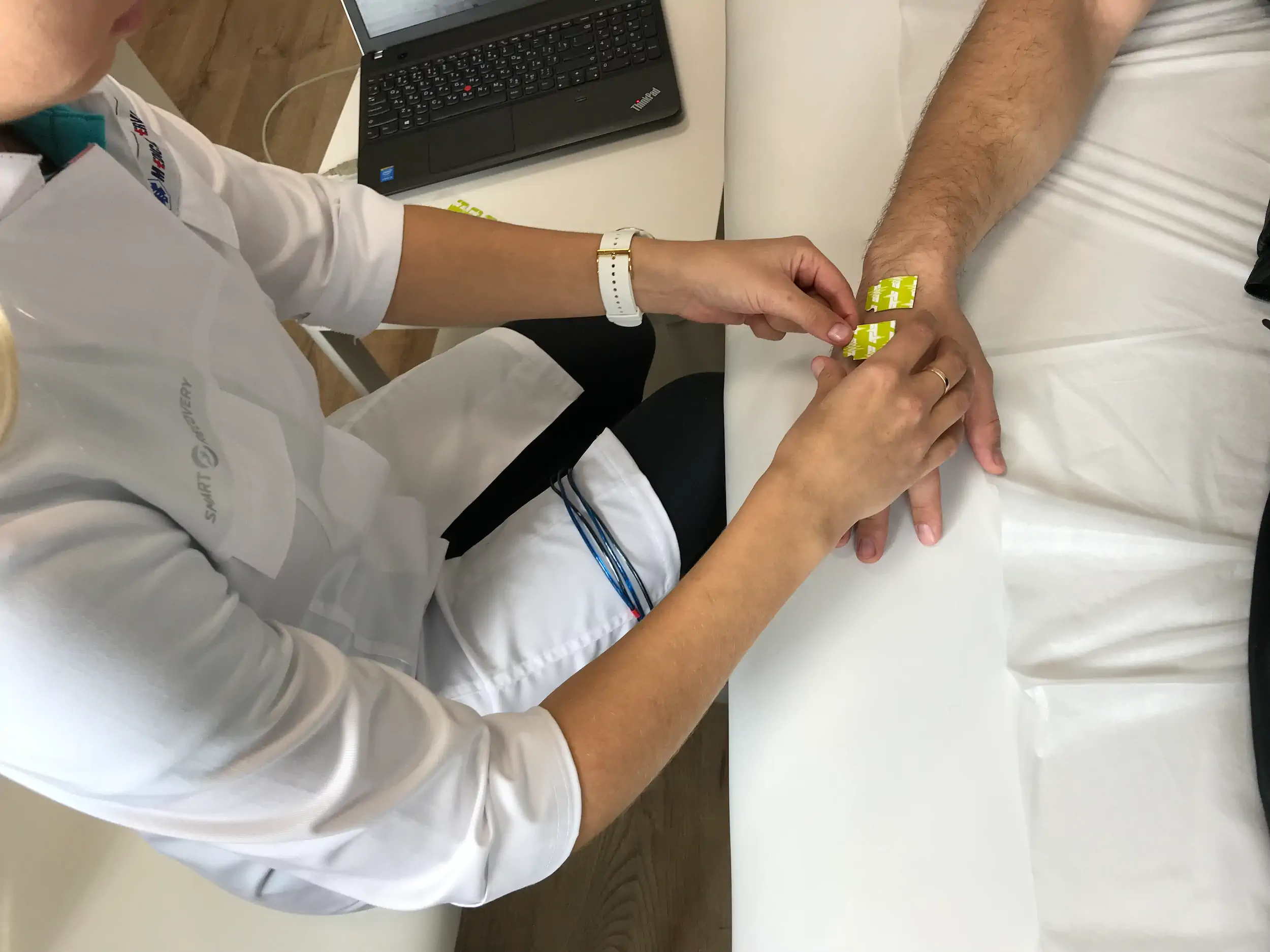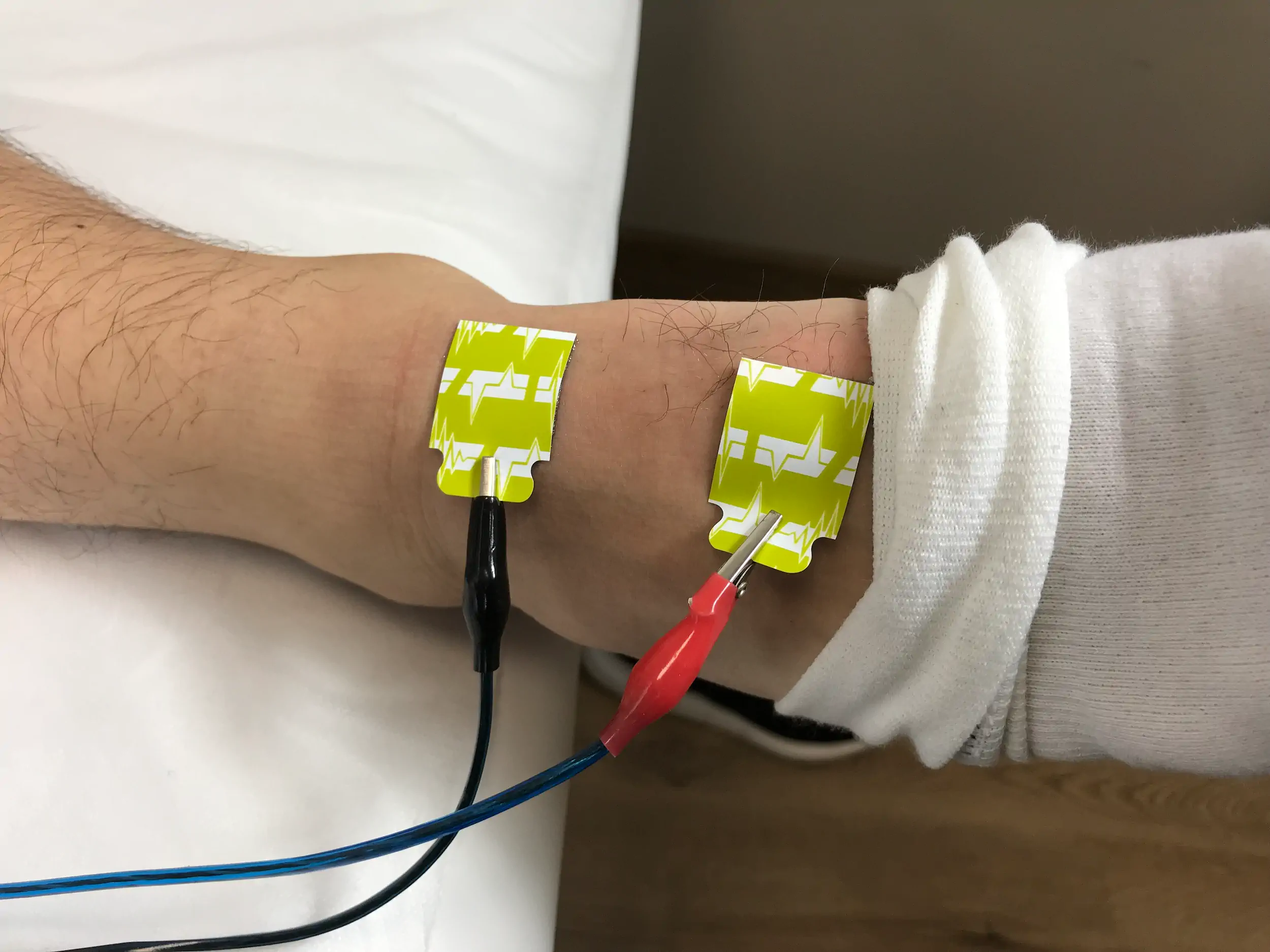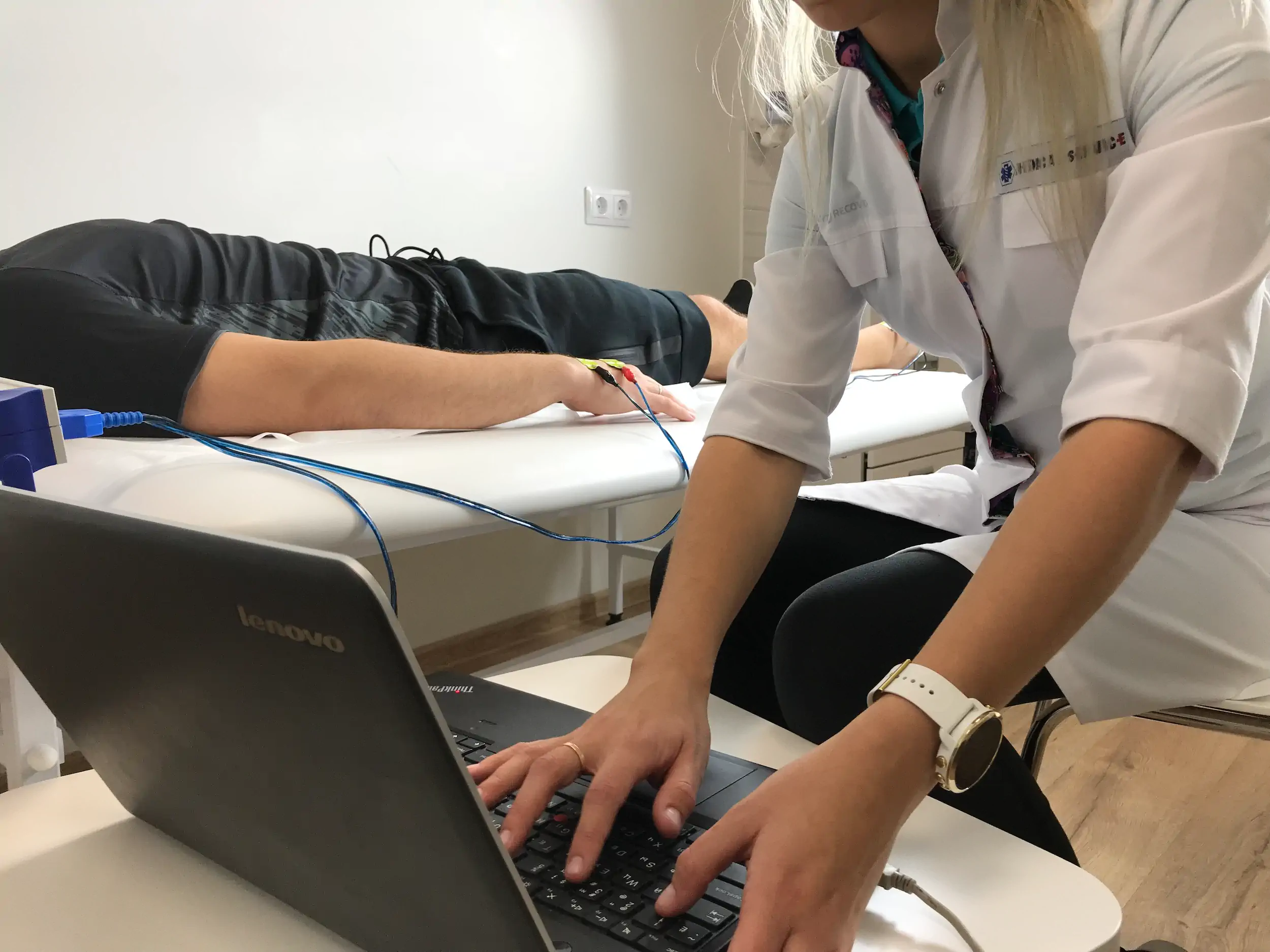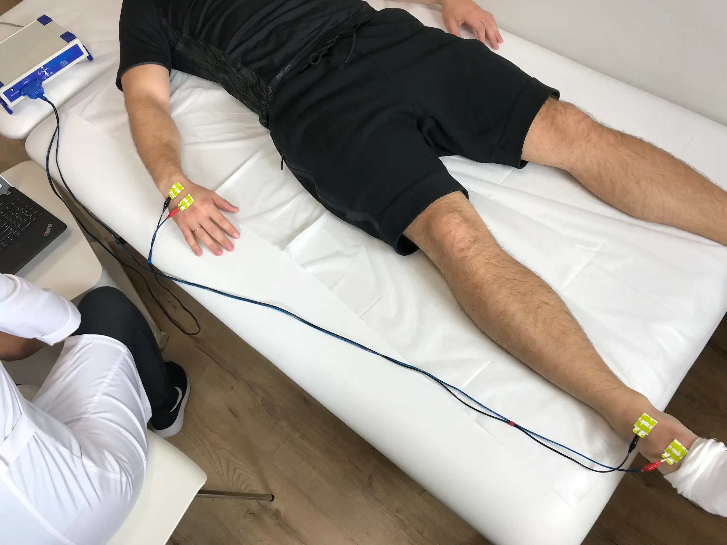 Размещение электродов: специалист наклеивает специальные электроды на вашу руку и ногу (обычно запястье и щиколотку).