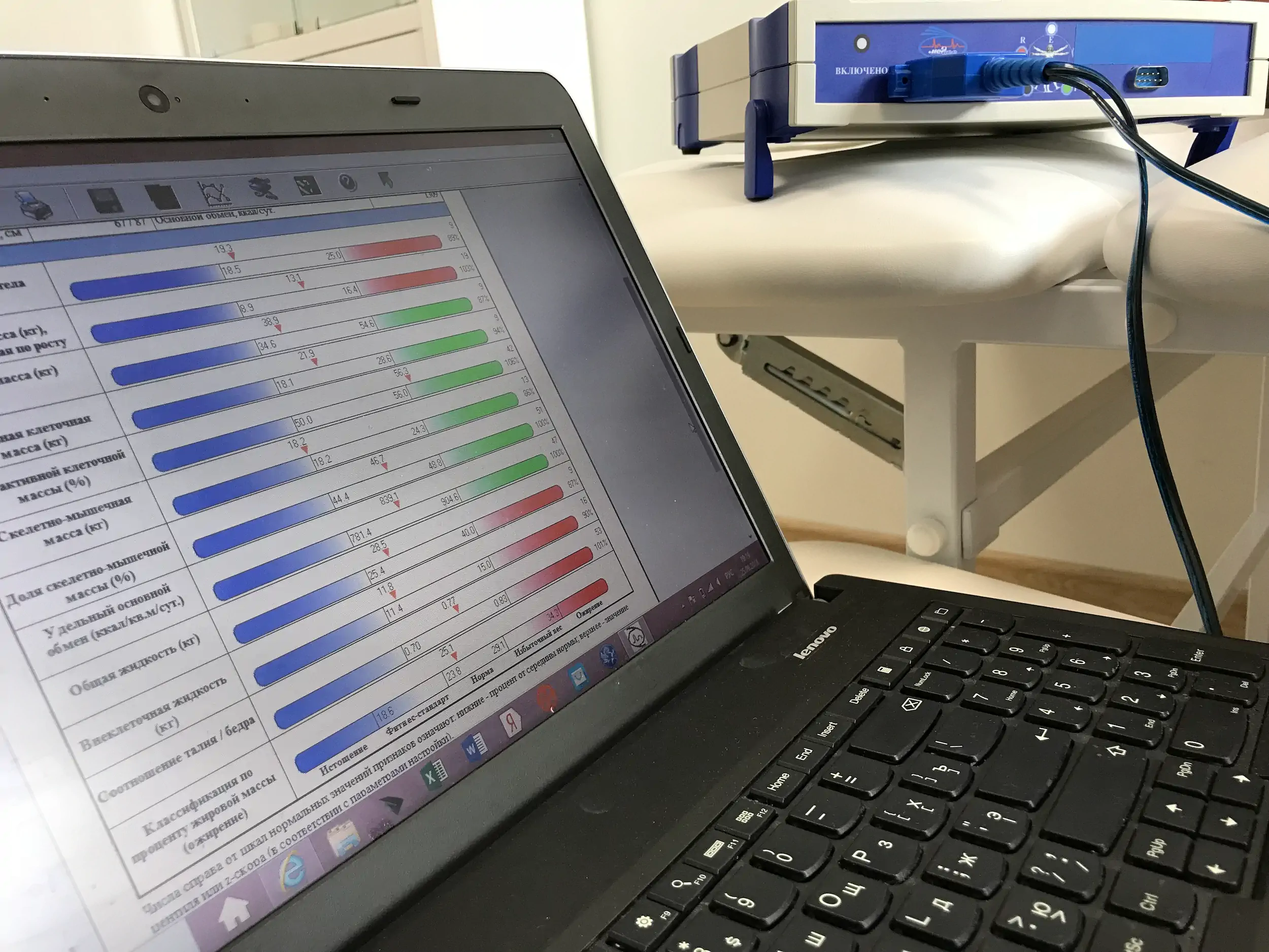 Проведение анализа: аппарат пропускает слабый электрический ток через ваше тело (вы ничего не почувствуете) и измеряет сопротивление тканей.
