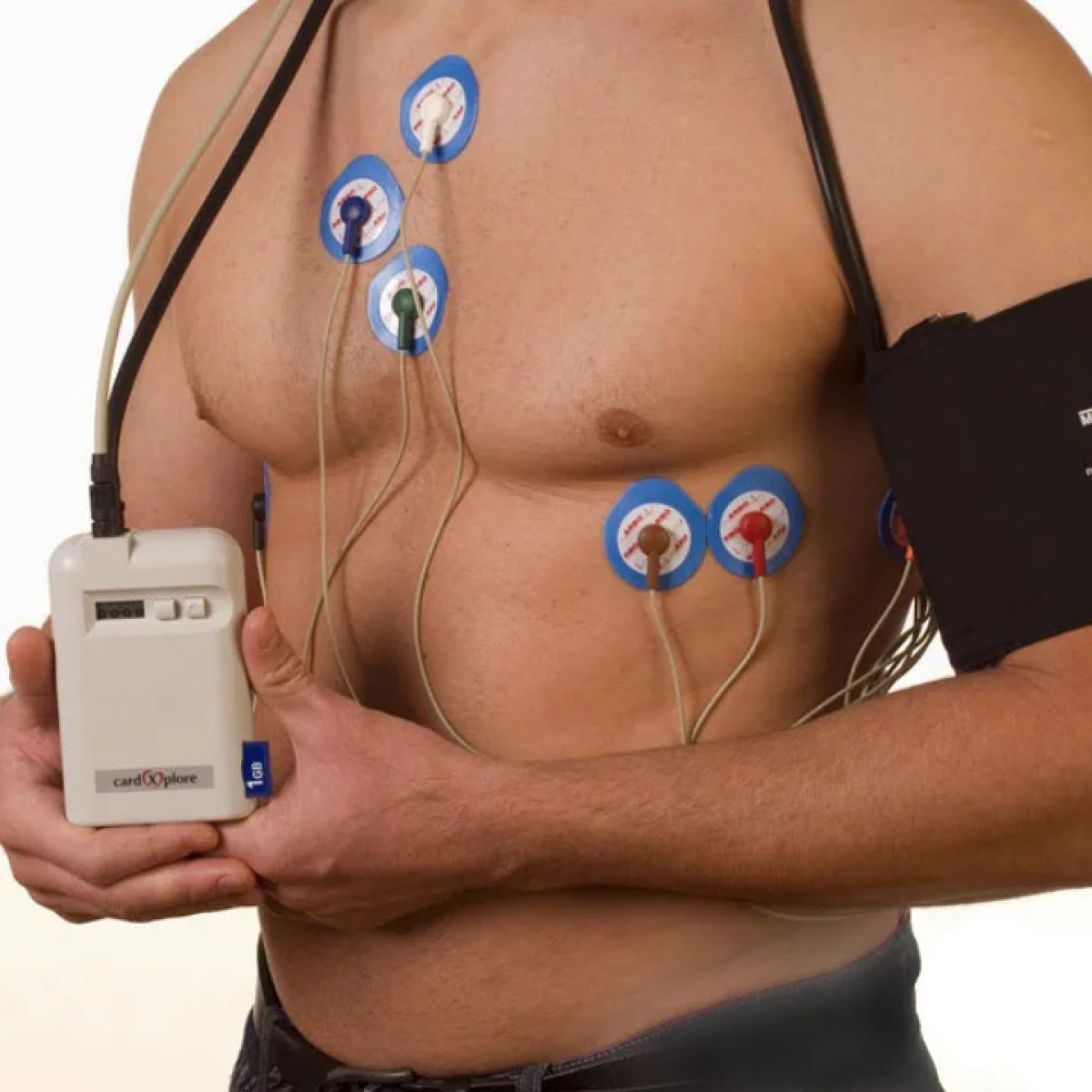- Установка электродов: на грудь накладываются несколько электродов, которые соединяются проводами с портативным регистратором.