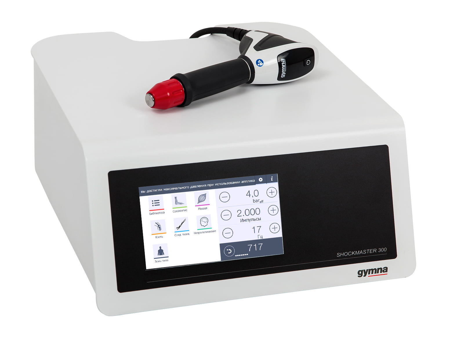 Генерирование ударных волн: аппарат Gymna генерирует высокоэнергетические ударные волны. Вы услышите щелчки и почувствуете импульсы в области воздействия.